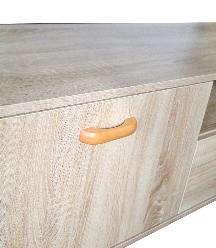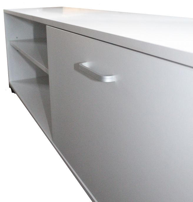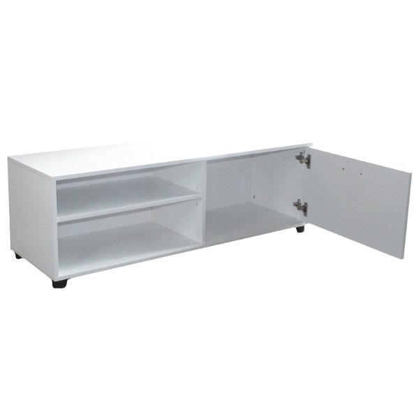 your new entertainment unit has 2 open compartments areas and 1 storage door .